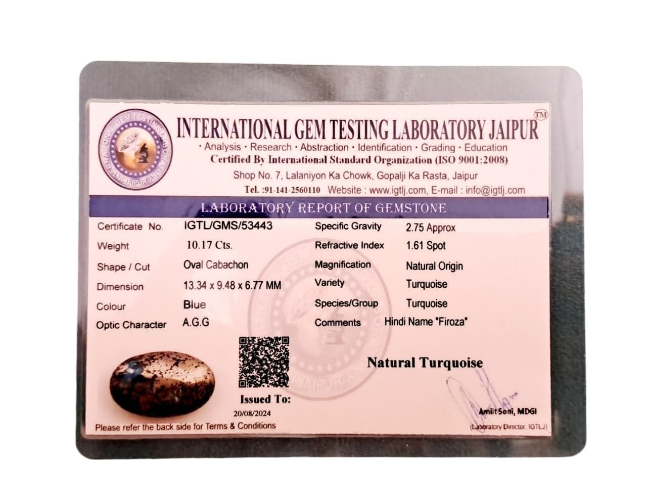 IGL Natural Firoza Turquoise Beautiful Pure Lab Certified Irani Firoza Exclusive Double Polished Gemstones for Peace, Protection Name and Fame for Men and Women (9 to 10 Carat)